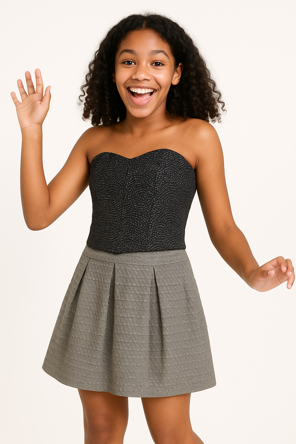 - Fabric: Textured stretchy fabric with subtle shimmer