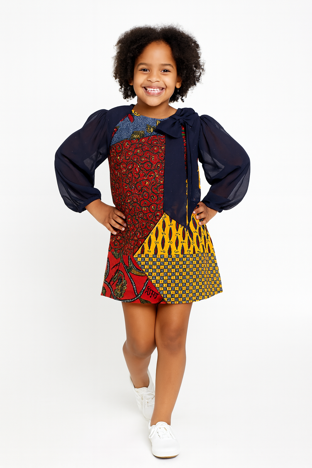 Bright, bold, and full of personality, this Ankara Patchwork Dress is designed to make every little girl stand out. The dress features a vibrant mix of red, yellow, and blue Ankara prints, paired with soft, sheer navy sleeves for a stylish contrast. A chic bow detail at the neckline adds a playful, feminine touch, making it perfect for both casual outings and festive occasions.